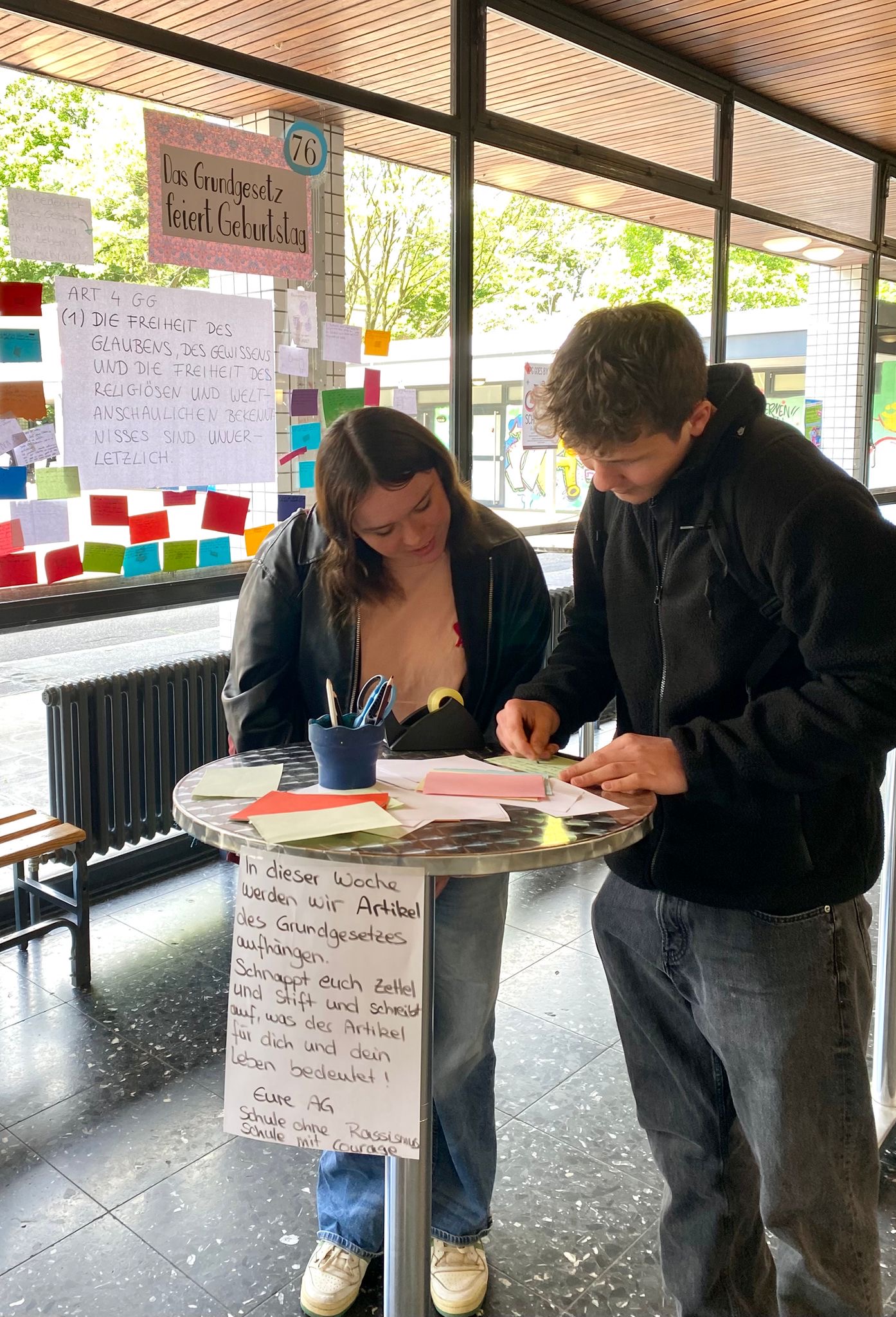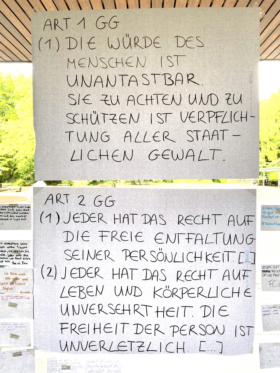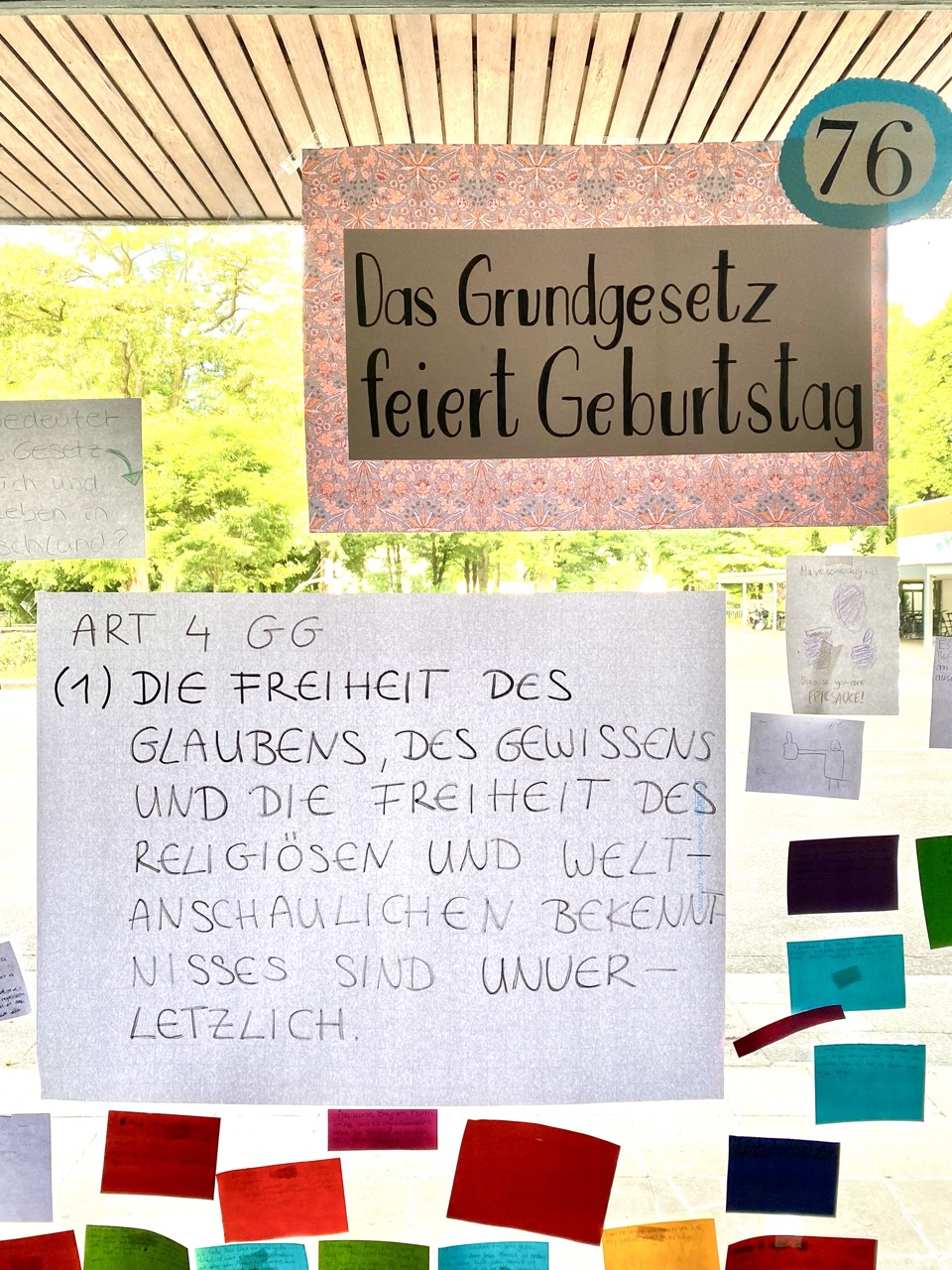 Unsere Schülerinnen und Schüler hatten die Gelegenheit, sich in der Pausenhalle zu verschiedenen Artikeln des Grundgesetzes zu äußern. Dabei haben sie darüber nachgedacht, wie diese Artikel in ihrem eigenen Leben berücksichtigt werden können und wie sie Demokratie aktiv leben.