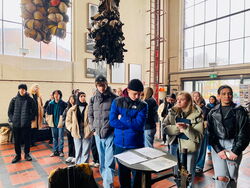 Es entsteht vor dem Musiktheater, das nach dem Turnier zum Museum mit einer virtuellen Ausstellung wird. Botschafterin für das Projekt des Referats Kultur der Stadt Gelsenkirchen ist Fußballweltmeisterin Steffi Jones. Wobei die Konzeption und künstlerische Leitung des gesamten Projekts bei der Künstlerin Alma Gildenast liegt. Ganz konkret für das MPG bedeutet dies, dass die Vorbereitungen für dieses Event in der Gastgeberstadt Gelsenkirchen schon seit Monaten auf Hochtouren laufen und das wegweisende Projekt „Stadion der Träume“ 15 Schüler:innen unserer Schule seit Januar in die künstlerische Ideenfindung involviert. Die erste Veranstaltung fand im Rahmen der überregional bekannten Mythos Tour von Olivier Kruschinski statt. Herr Kruschinski verstand es, unseren Schüler:innen die Stadt Gelsenkirchen hinsichtlich ihrer architektonischen und städtischen Geschichte näher zu bringen und wir besuchten das Musiktheater, die St. Joseph Kirche in Schalke, die Zeche Consol in Bismarck und die Schalke Arena. So bekamen wir einen ersten Eindruck davon, wie in Gelsenkirchen Träume entstehen und gelebt werden.